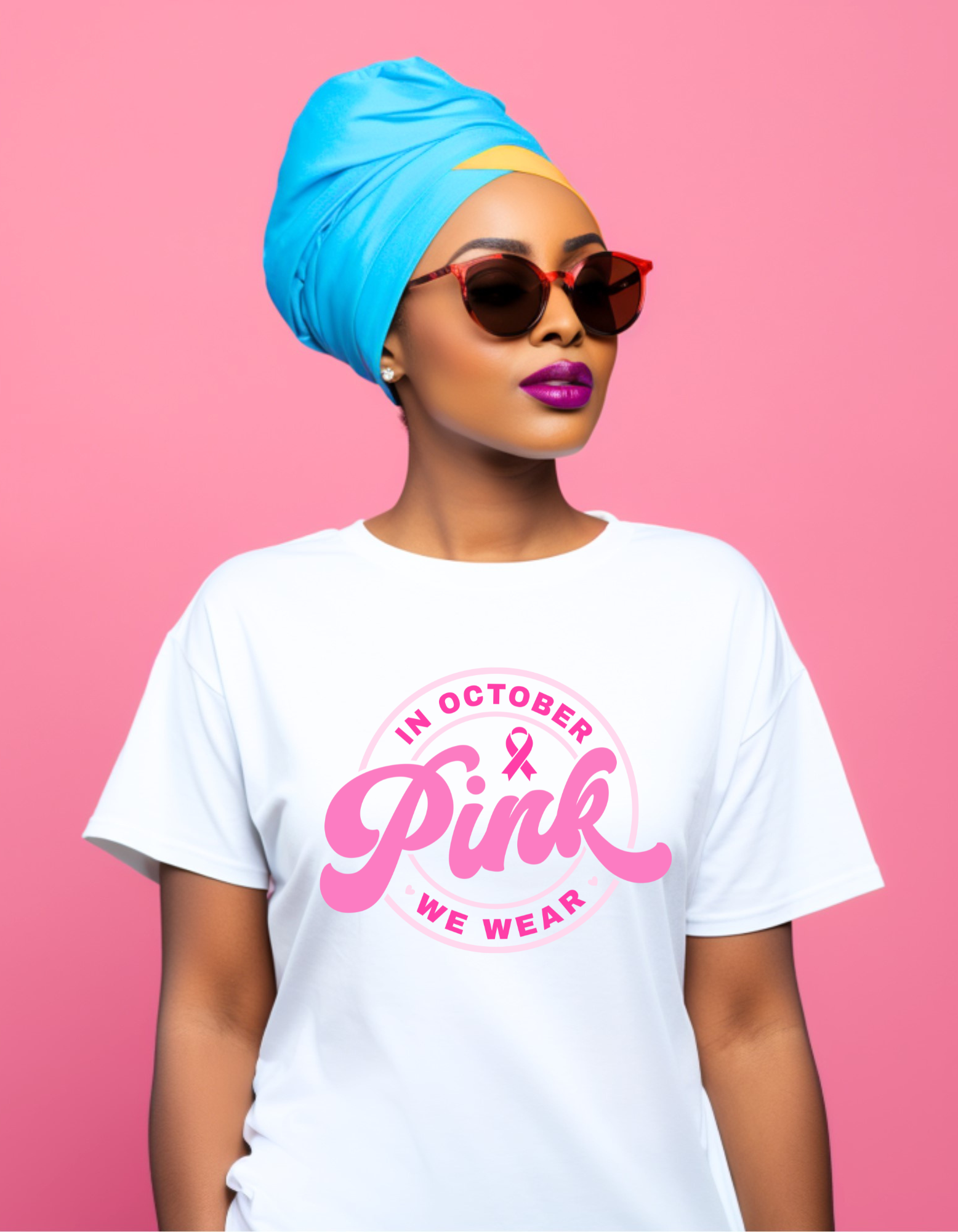 Show your support in style with our In October We Wear Pink Tee! Designed with the iconic pink ribbon at its heart, this shirt is a bold reminder of strength, unity, and awareness during Breast Cancer Awareness Month.